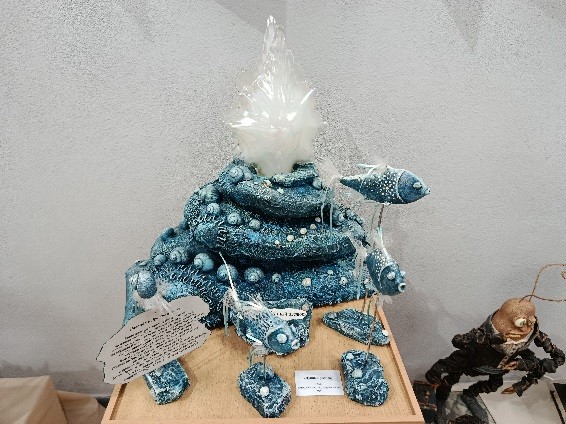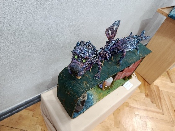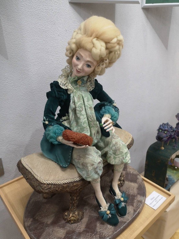В экспозиции выставки можно увидеть первую работу Ларисы Матюшенковой «Тайна горохового королевства». Пожилая королева сидит на диванчике и смотрит на маленькую горошинку на подушечке в своей руке. Когда-то очень давно именно эта горошинка доказала, что она – настоящая принцесса. Когда Лариса делала свою первую куклу-бабушку, в интернете просмотрела много фотографий пожилых людей, обращала внимание на их лица и руки, где больше всего видны морщины. О пожилом возрасте королевской особы говорят морщинки на лице. Складочки возле губ и глаз показывают добрый характер ее величества. И, несмотря на дорогое платье и высокую прическу, кукла не выглядит гордой и надменной. А, наоборот, она как ласковая бабушка смотрит на гостей со своего трона. Автор показала, что кукла может выглядеть как живая, что ей присущи эмоции и характер.