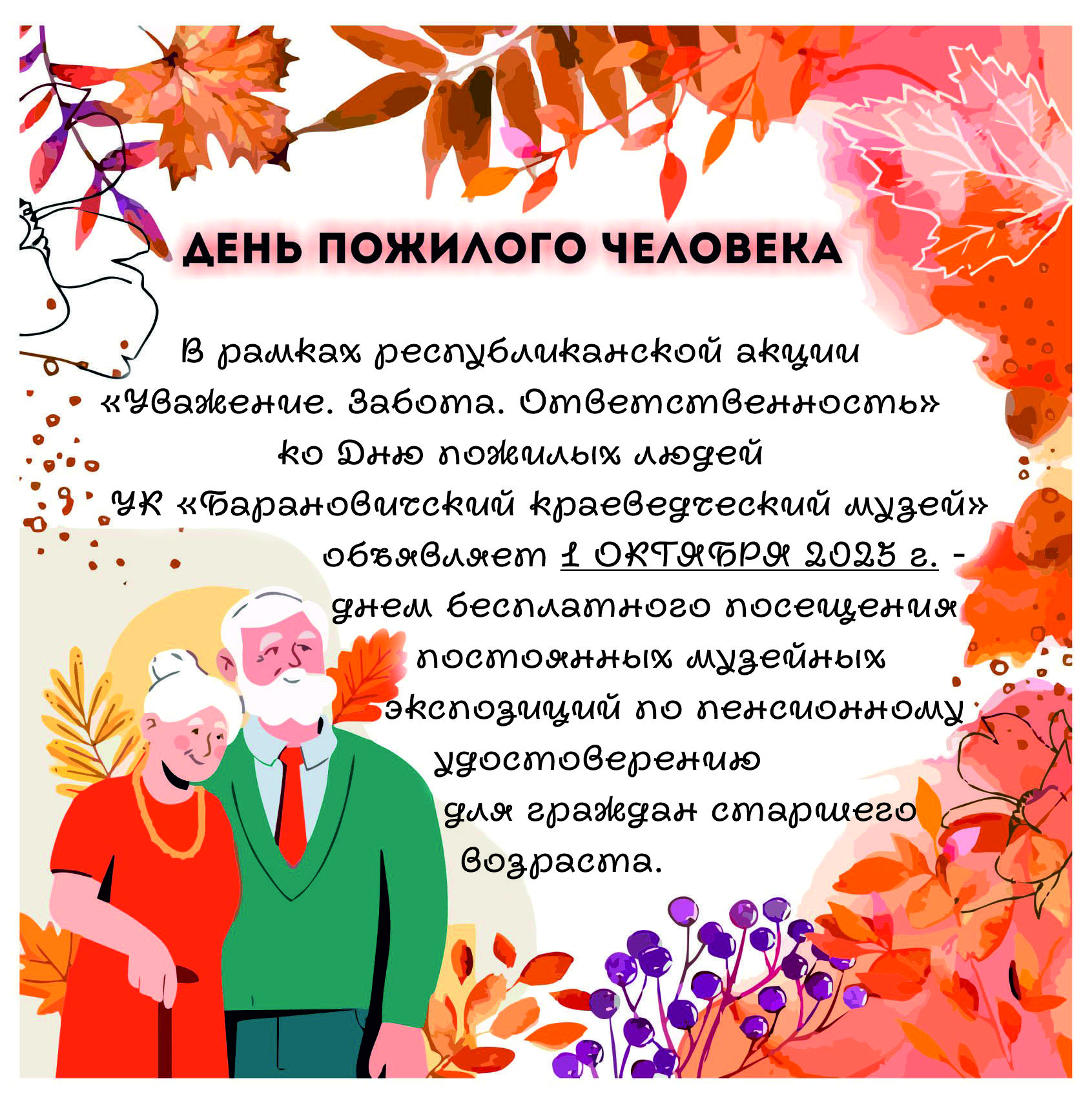 В рамках республиканской акции «Уважение. Забота. Ответственность» ко Дню пожилых людей УК «Барановичский краеведческий музей» объявляет 1 ОКТЯБРЯ 2025 г. – днем бесплатного посещения постоянных музейных экспозиций